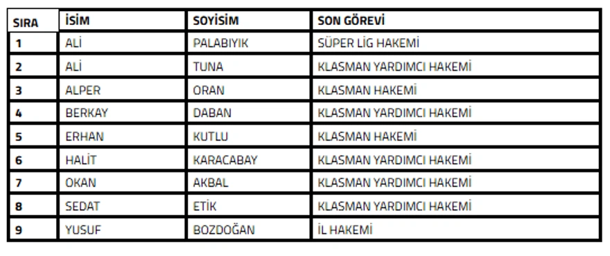 Süper Lig hakemi Ali Palabıyık'ın da bulunduğu listede şu isimler yer aldı: