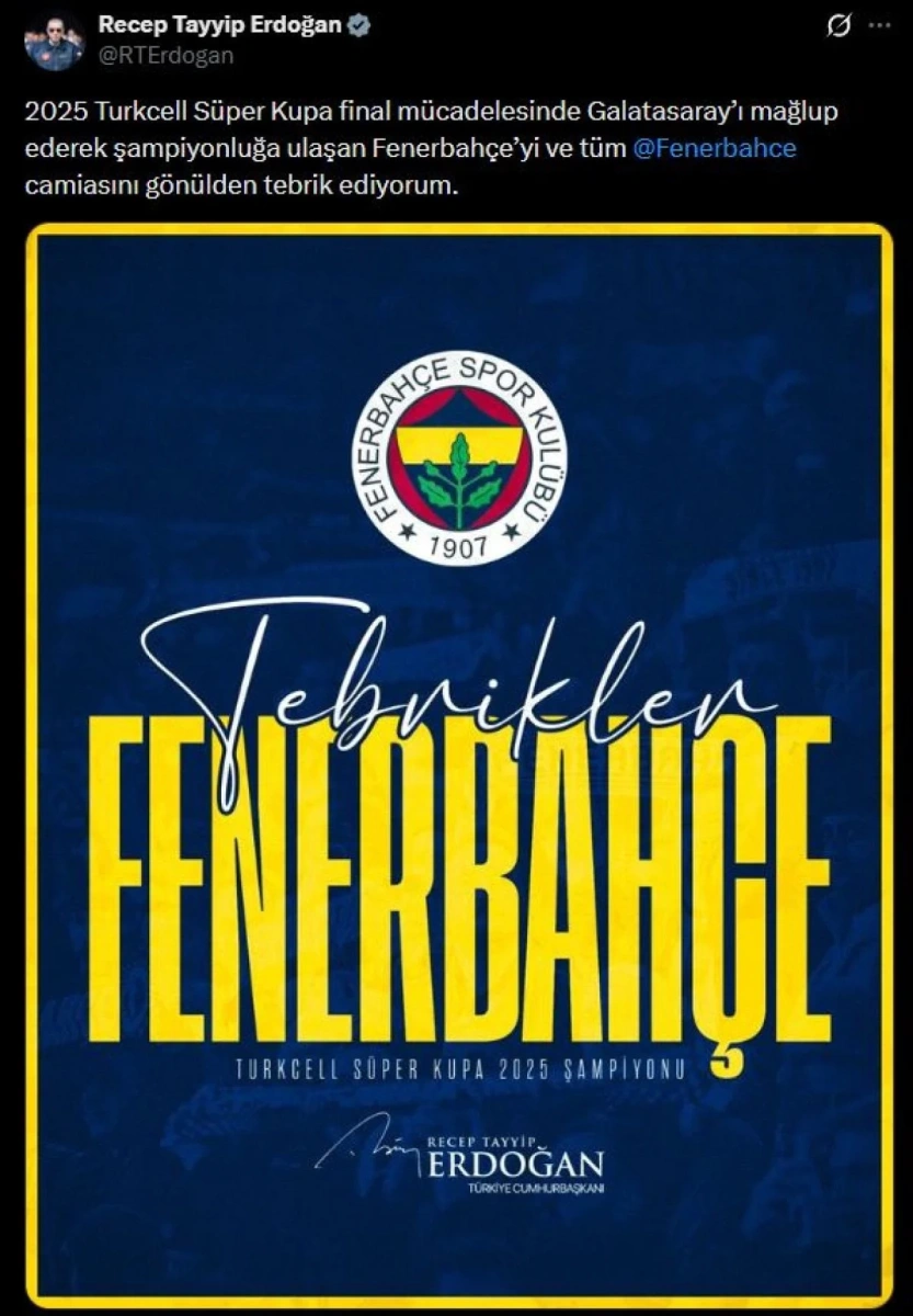 Erdoğan mesajında "Galatasaray'ı mağlup ederek şampiyonluğa ulaşan Fenerbahçe'yi ve tüm Fenerbahçe camiasını gönülden tebrik ediyorum" ifadelerini kullandı.