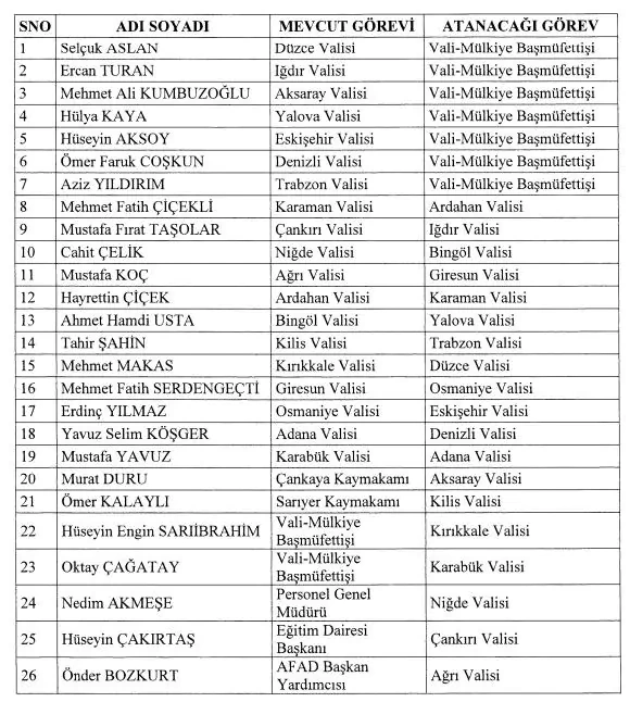 Kilis Valisi Tahir Şahin Trabzon'a, Kırıkkale Valisi Mehmet Makas Düzce'ye, Giresun Valisi Mehmet Fatih Serdengeçti Osmaniye'ye, Osmaniye Valisi Erdinç Yılmaz Eskişehir'e, Adana Valisi Yavuz Selim Köşger Denizli'ye, Karabük Valisi Mustafa Yavuz Adana'ya atandı.