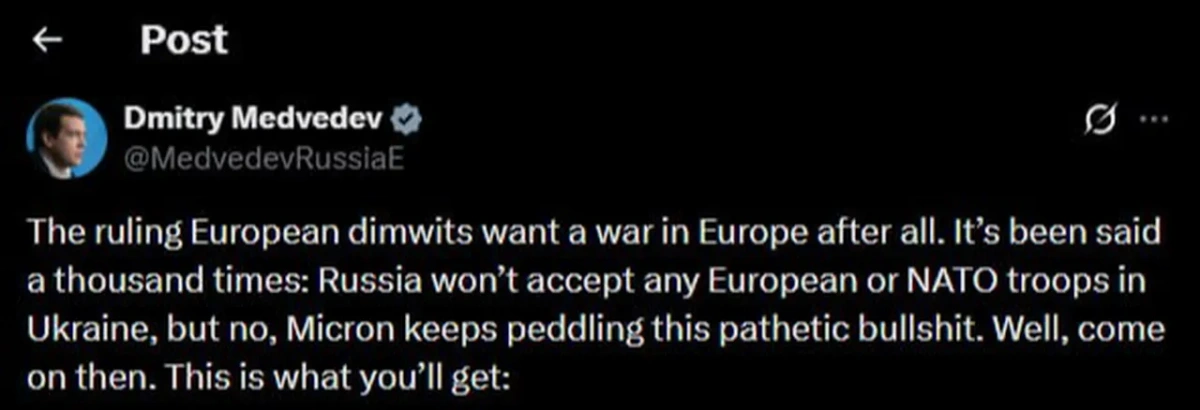 Rusya Güvenlik Konseyi Başkan Yardımcısı Dmitriy Medvedev, sosyal medyadan yaptığı paylaşımda Avrupa liderlerine ağır hakaretler yöneltti.