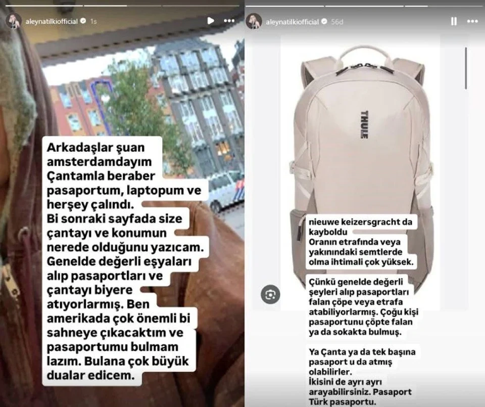 Şarkıcı Aleyna Tilki, Amsterdam'da çantasının çalındığını ve içinde pasaport, laptop ve değerli eşyalarının bulunduğunu açıkladı. Amerika'da sahneye çıkacak olan Tilki, pasaportunu bulması gerektiğini belirterek sosyal medyadan yardım istedi. Çantasının Nieuwe Keizersgracht'ta kaybolduğunu belirten sanatçı, hırsızların genellikle değerli eşyaları alıp pasaportları çöpe attığını söyledi.