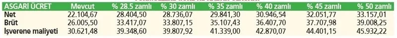 Yüzde 30 zam yapılması halinde net 28 bin 736 lira, yüzde 35 zam ile 29 bin 841 lira, yüzde 40 artışla 30 bin 946 lira olacak.