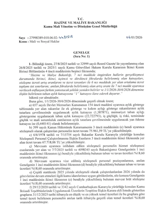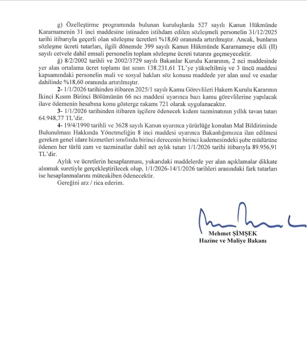 Hazine ve Maliye Bakanı Mehmet Şimşek'in imzaladığı Mali ve Sosyal Haklar Genelgesi yürürlüğe girerek memur ve memur emeklilerine yüzde 18,60 oranında maaş zammı kesinleşti. Genelge kapsamında kıdem tazminatı tavanı 64 bin 948 lira 77 kuruşa, bedelli askerlik ücreti 333 bin 89 lira 4 kuruşa yükseldi. 1-14 Ocak tarihleri arasındaki maaş farkları hesaplandıktan sonra ilgililere ödenecek.