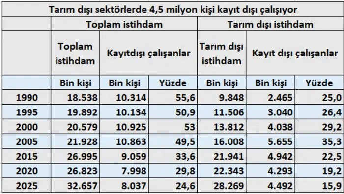 Buna karşın tarım dışı sektörlerde 4 milyon 492 bin kişi hâlâ kayıt dışı çalışmaya devam ediyor.