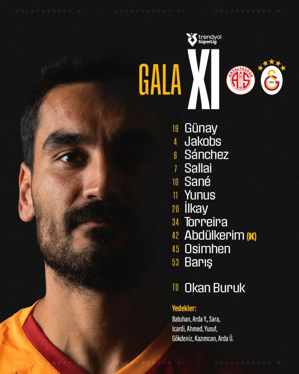Galatasaray: Günay, Jakobs, Sanhcez, Sallai, Sane, Yunus, İlkay, Torreira, Abdülkerim, Osimhen, Barış.
