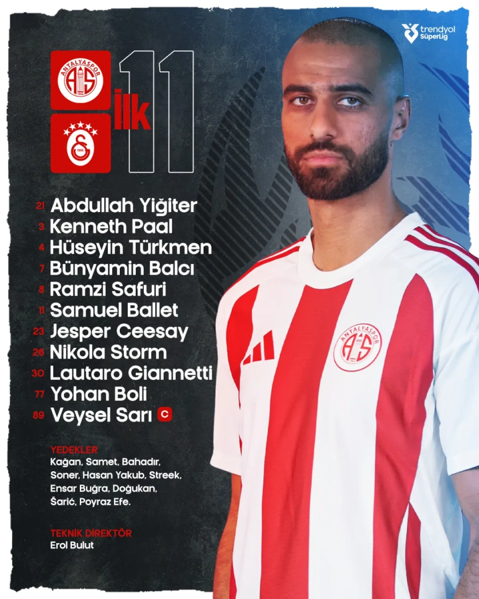 Trendyol Süper Lig'in 16. haftasında Galatasaray, bugün saat 20.00'de Antalyaspor deplasmanına çıkıyor. Son iki deplasmanda yenilgi ve beraberlik alan sarı-kırmızılılar, Antalyaspor karşısında son 6 maçını kazanarak bu kötü seriyi bitirmek istiyor. Her iki takımın ilk 11'leri açıklandı.