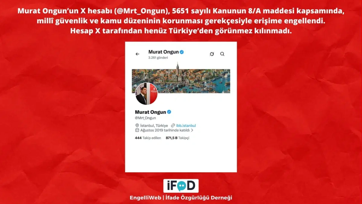 İBB soruşturması kapsamında tutuklu bulunan eski Medya A.Ş. Yönetim Kurulu Başkanı Murat Ongun'un X hesabına "milli güvenlik ve kamu düzeni" gerekçesiyle erişim engeli getirildi. Ongun, sosyal medya hesabından Palazoğlu kardeşler hakkında çarpıcı iddialarda bulunuyor ve Muhittin Palazoğlu'nun Dışişleri Bakanı Hakan Fidan'ın oğluyla yakınlığını kullandığını iddia ediyordu. Ongun ayrıca, Palazoğlu kardeşlerin birbirlerini suçlayan çelişkili ifadelerine dikkat çekerek soruşturmanın tanık kalitesini eleştirmişti.