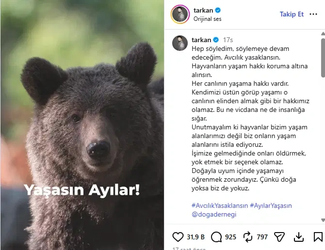 Megastar Tarkan, sosyal medya hesabından hayvanların yaşam hakkının korunması ve avcılığın yasaklanması yönünde önemli bir çağrıda bulundu.