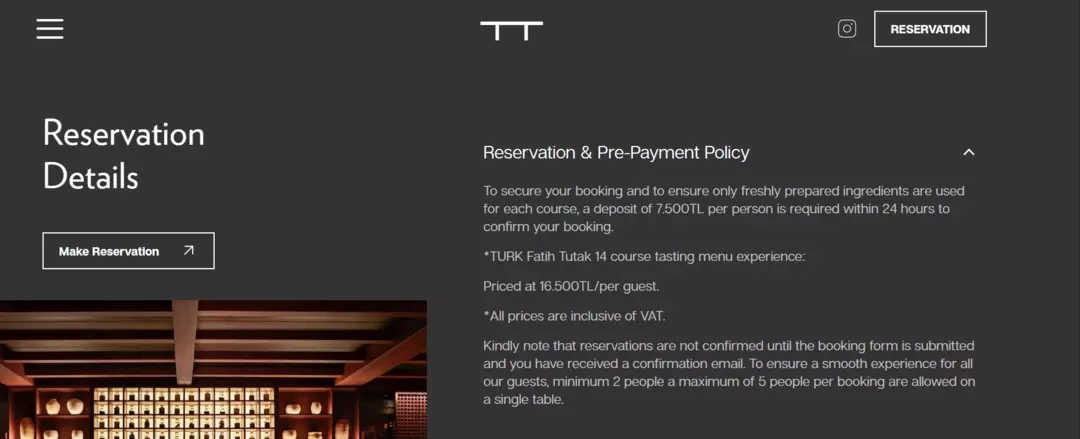 TURK Fatih Tutak'ın 14 aşamalı tadım menüsü deneyimi kişi başı 16.500 TL olarak fiyatlandırılıyor ve belirtilen tüm fiyatlara KDV dahil.