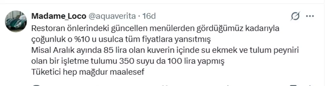 Bir kullanıcı, "Aralık ayında 85 lira olan kuverin içinde su, ekmek ve tulum peyniri olan bir işletme tulumu 350, suyu da 100 lira yapmış. Tüketici hep mağdur" yorumunu yaptı.