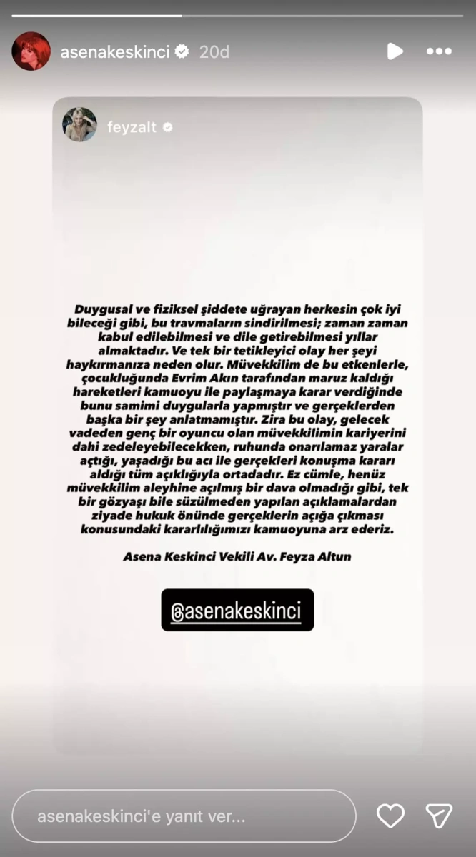 Bez Bebek dizisinde birlikte oynadıkları dönemde Evrim Akın'ın mobbing yaptığını ve babasıyla aynı evde yaşadığını iddia eden Asena Keskinci'nin açıklamaları magazin gündemini sarstı. İddialar üzerine ilk kez konuşan Evrim Akın gözyaşları içinde "İyilikten başka ne yaptım?" diyerek 7 yıl önceki mesajlaşmaları paylaştı. Keskinci'nin avukatı ise müvekkilinin gerçekleri anlattığını belirterek hukuk önünde kararlı olduklarını açıkladı.
