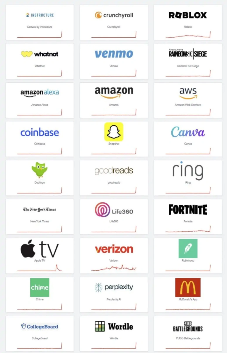 Snapchat, Amazon Web Hizmetleri, Epic Games Store, Zoom, Fortnite, Udemy, Ring, Clash Royale, PlayStation Network, Life360, Signal, Canva