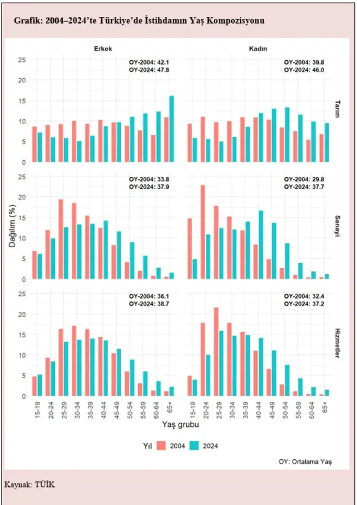 Raporda 2004-2024 döneminde Türkiye'de istihdamın yaş kompozisyonunun belirgin biçimde yaşlanma yönünde evrildiği belirtildi.