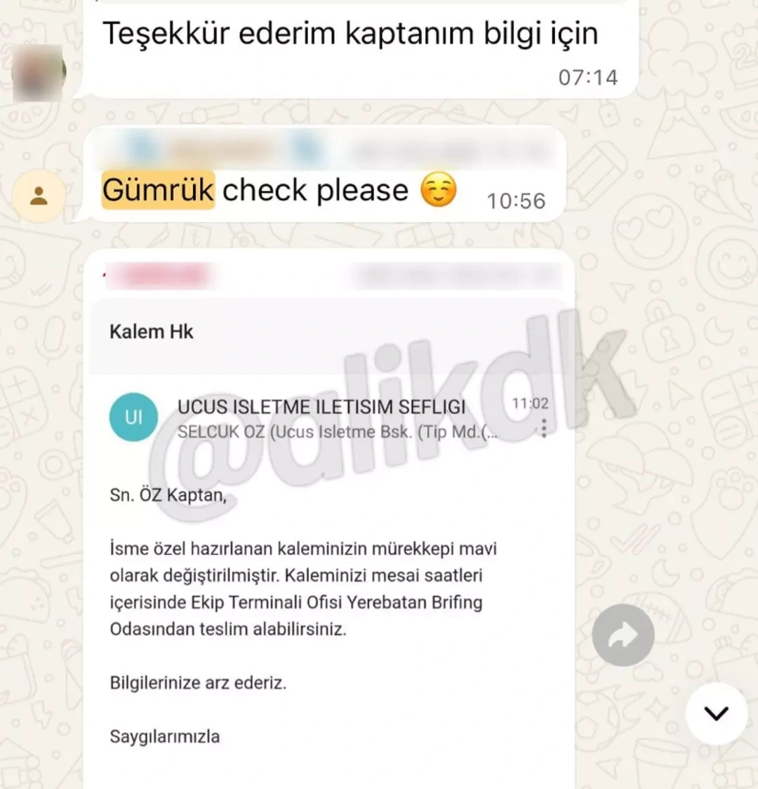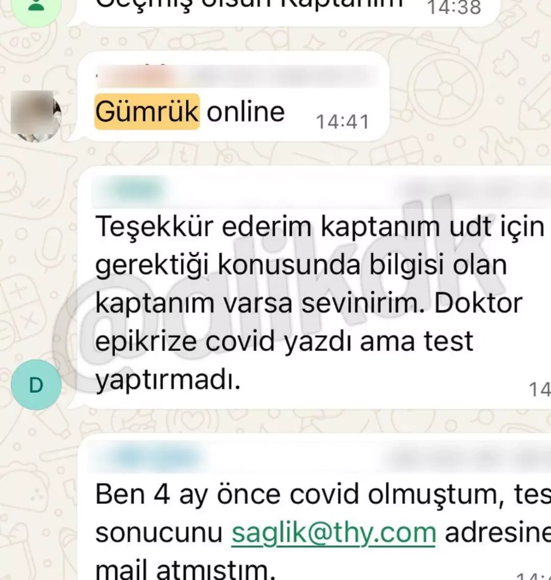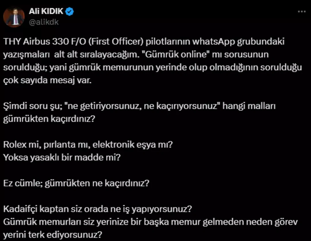 Türk havayolu şirketinde çalışan pilotların, gümrükten mal kaçırmak için "Gümrük memuru yerinde mi?" diye sorduğu WhatsApp grubu yazışmaları ifşa oldu. AirportHaber Koordinatörü Ali Kıdık, ekran görüntülerini paylaşarak pilotlara "Gümrükten ne kaçırdınız? Rolex mi, pırlanta mı, yasaklı madde mi?" diye sordu. Yazışmalarda "Gümrük online mı?" gibi sorular sıkça geçiyor.