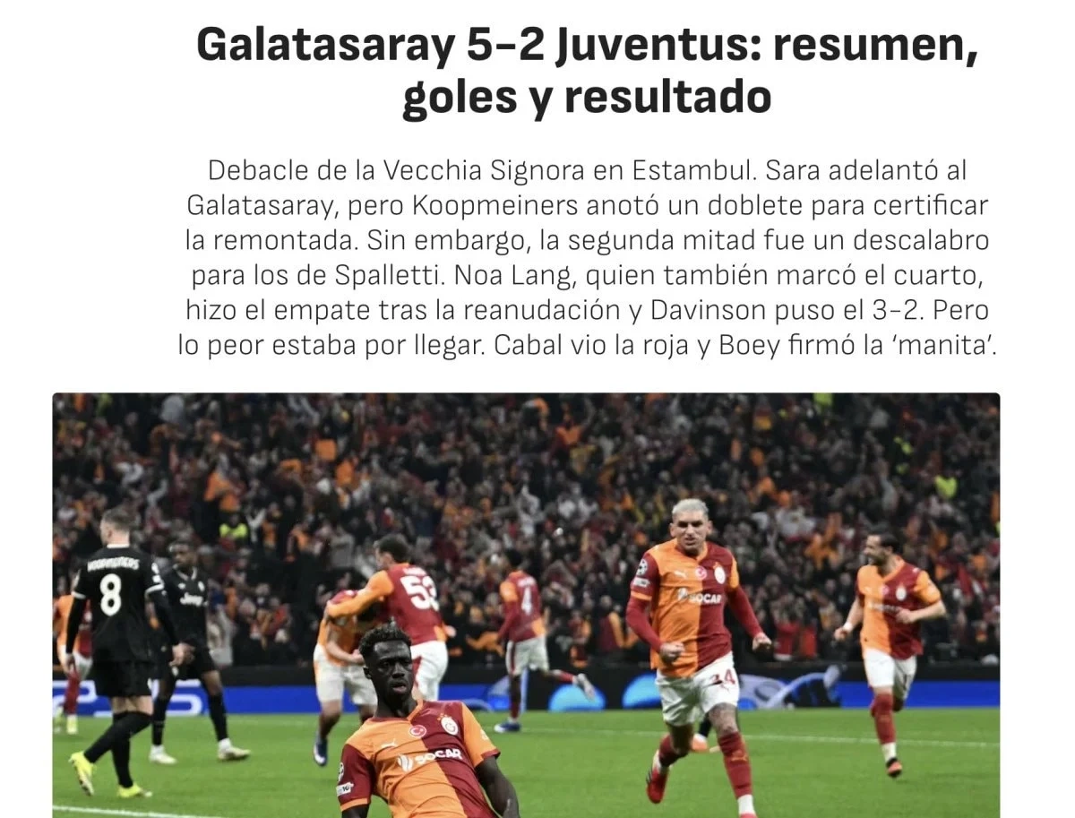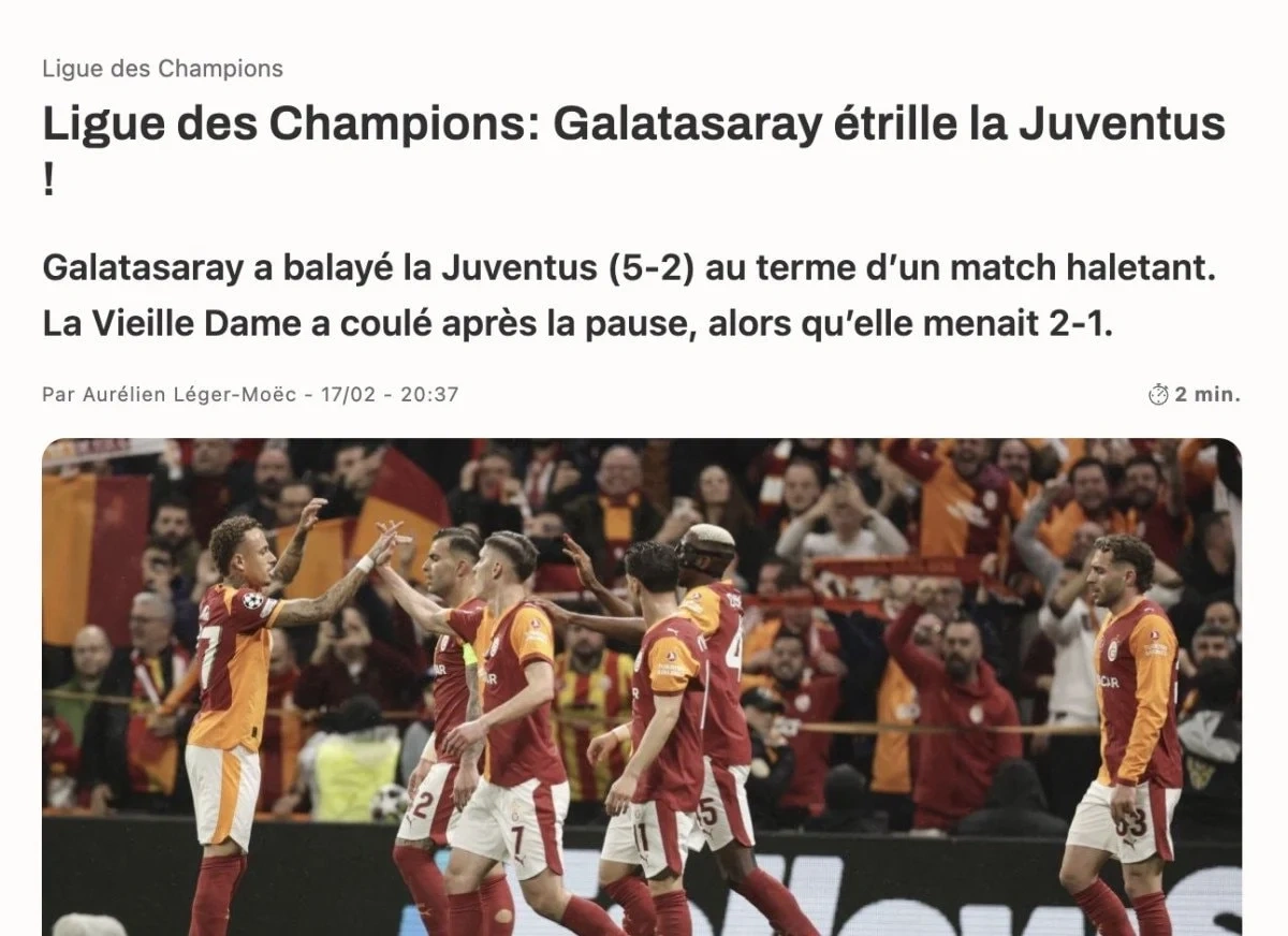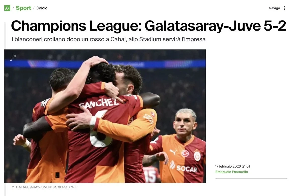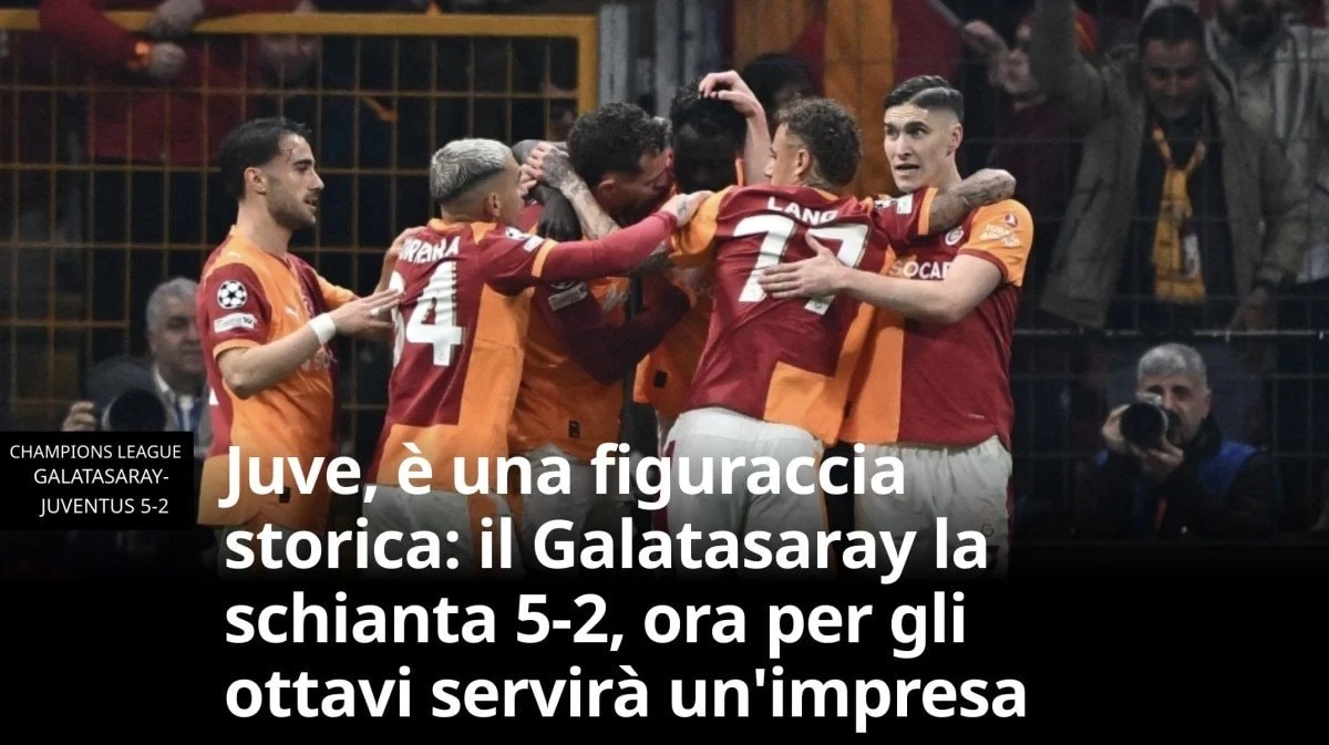 Galatasaray, UEFA Şampiyonlar Ligi play-off ilk maçında Juventus'u RAMS Park'ta 5-2 mağlup ederek tarihi bir galibiyet elde etti. Sarı-kırmızılıların gollerini Sara, Lang (2), Davinson Sanchez ve Boey kaydetti; Cabal'ın 67. dakikada kırmızı kart görmesi maçın seyrini Galatasaray lehine çevirdi. Zaferin yankıları Avrupa basınında büyük yer buldu; İtalyan, İspanyol, Fransız ve Alman gazeteler manşetlerini Galatasaray'a ayırdı.