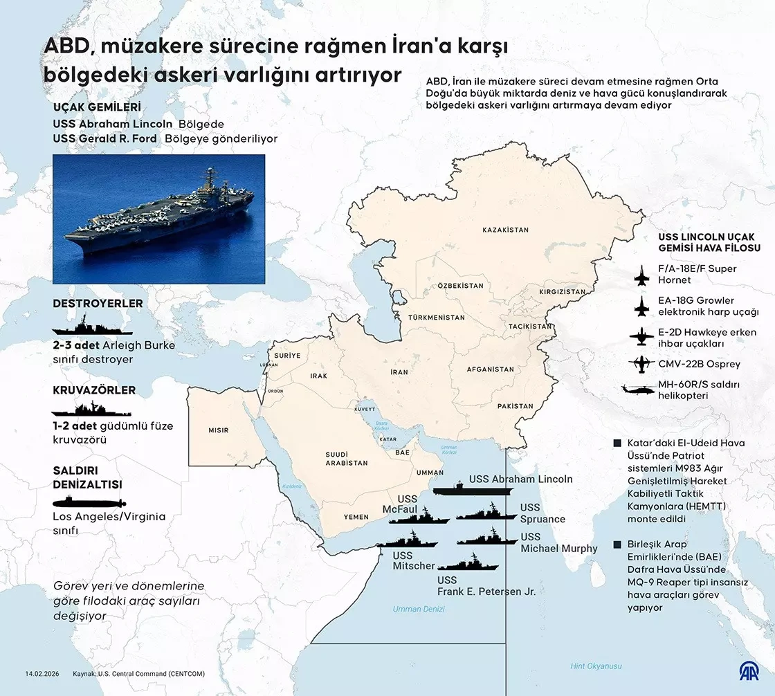 ABD, 2003 Irak işgalinden bu yana en büyük askeri yığınağını gerçekleştirerek Orta Doğu'ya iki uçak gemisi, F-22 Raptor filosu ve 30-50 bin asker sevk etti. Pentagon, İran'ı Umman Denizi ve Akdeniz'den aynı anda baskı altına almayı hedefleyen "çift kıskaç" stratejisi uygularken Patriot ve THAAD sistemleri de bölgeye konuşlandırıldı. Trump, Tahran'a yeni bir nükleer anlaşma için 10-15 günlük süre tanırken uzmanlar bu yığınağın müzakerelerin çökmesi halinde başlayacak bir operasyonun hazırlığı olduğunu vurguluyor.