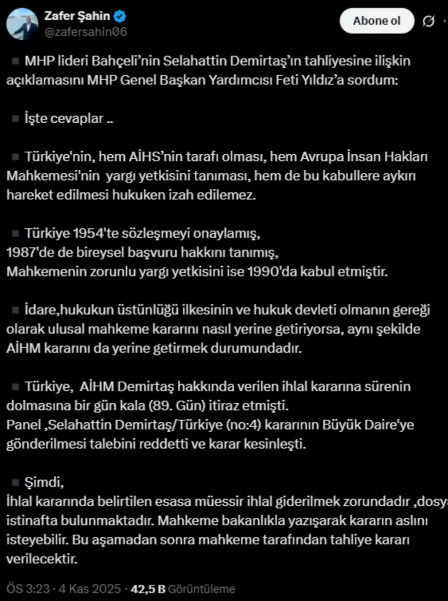 MHP Genel Başkan Yardımcısı Feti Yıldız, AİHM'in Selahattin Demirtaş hakkındaki ihlal kararının kesinleşmesinin ardından sürecin nasıl işleyeceğini açıkladı. Yıldız, mahkemenin bakanlıkla yazışarak kararın aslını isteyeceğini ve bu aşamadan sonra tahliye kararı verileceğini belirtti. MHP lideri Bahçeli'nin "Tahliyesi hayırlı olur" açıklaması sonrası gelen bu değerlendirme, Türkiye'nin AİHM kararlarını yerine getirmek zorunda olduğunu vurguladı.