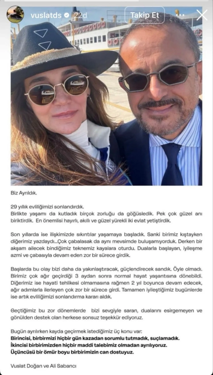 Ali Sabancı ile Vuslat Doğan, 29 yıl süren evliliklerine nokta koydu. Çift, ayrılıklarını paylaştıkları ortak açıklama ve fotoğrafla duyurdu.