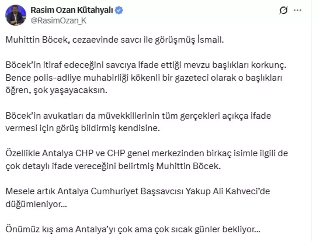 Rüşvet soruşturması kapsamında tutuklanan Antalya Büyükşehir Belediye Başkanı Muhittin Böcek'in etkin pişmanlıktan yararlanmak için Antalya Başsavcılığı'na başvurduğu iddia edildi. Rasim Ozan Kütahyalı, Böcek'in itiraf edeceğini savcıya ifade ettiği başlıkların 'korkunç' olduğunu ve CHP Antalya ile genel merkezden bazı isimlerle ilgili detaylı ifade vereceğini belirtti. Avukatlarının da tüm gerçekleri açıklaması yönünde görüş bildirdiği Böcek'in itiraflarıyla Antalya'da sıcak günlerin yaşanacağı öne sürüldü.