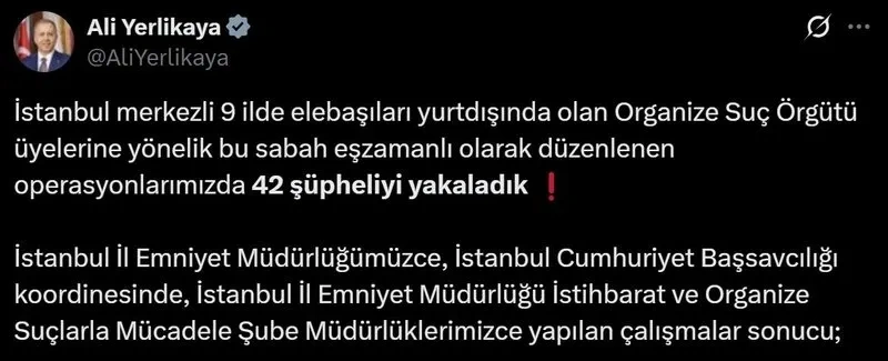 İçişleri Bakanı Ali Yerlikaya sosyal medyadan yaptığı açıklamada, "İstihbarat birimlerimizin ve güvenlik güçlerimizin koordineli çalışmalarıyla, hiçbir suç ve suçlunun cezasız kalmaması için organize suç örgütlerine yönelik yürüttüğümüz mücadelemize kararlılıkla devam ediyoruz" dedi.