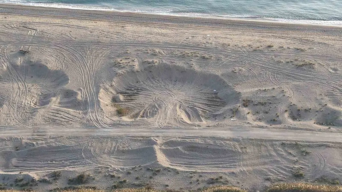 Dron çekimleri, sahilin kum hırsızları tarafından derin çukurlarla talan edildiğini ve doğal yapının ciddi şekilde bozulduğunu gösterdi.
