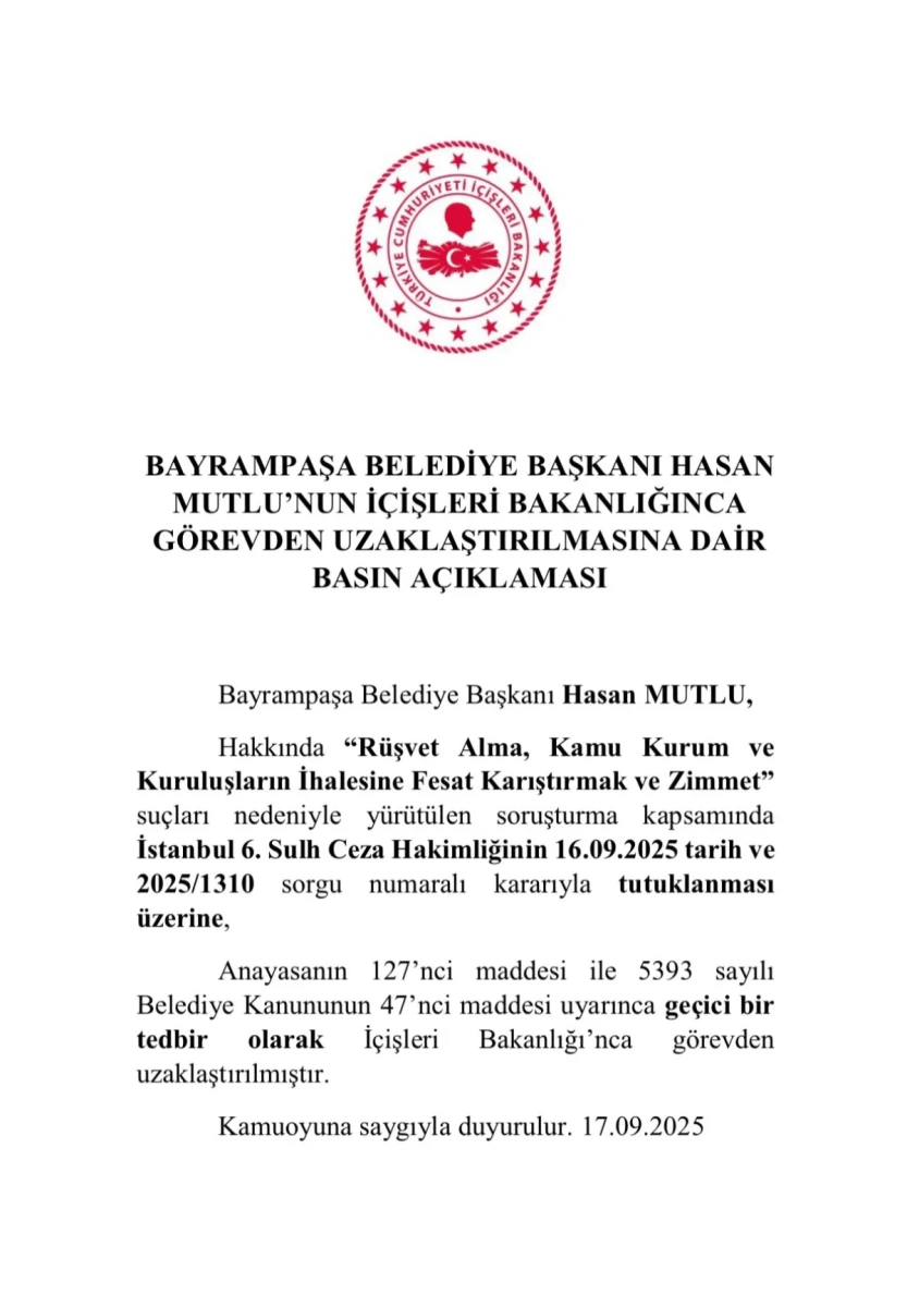 Bayrampaşa Belediye Başkanı Hasan Mutlu, yolsuzluk soruşturması kapsamında tutuklandı ve görevden uzaklaştırıldı.