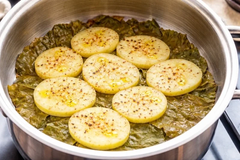 Sarmaları tencereye dizmeden önce tabanı asma yaprağı, lahana yaprağı ya da ince dilimlenmiş patatesle kapatmak gerekir.