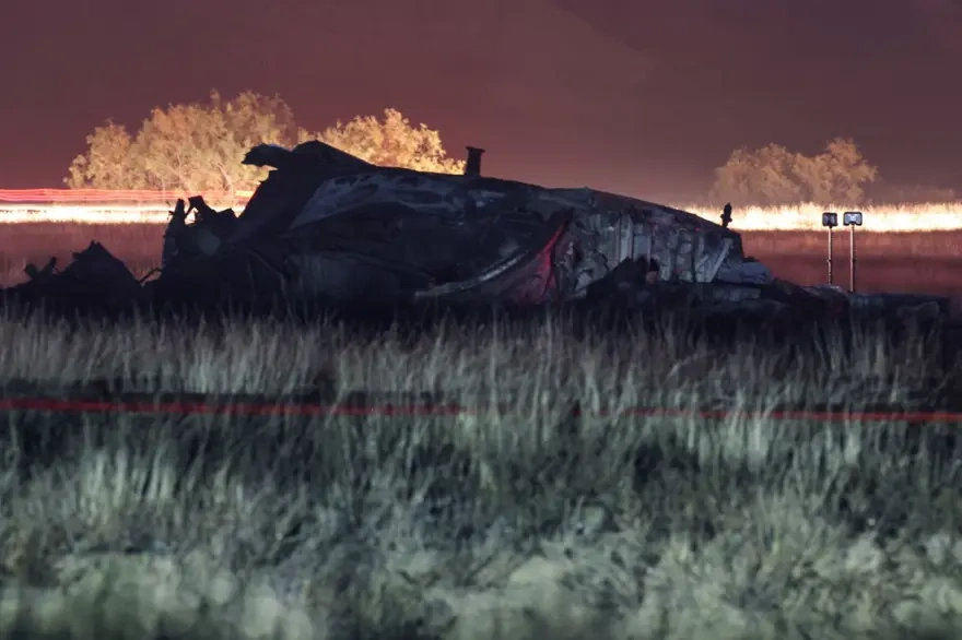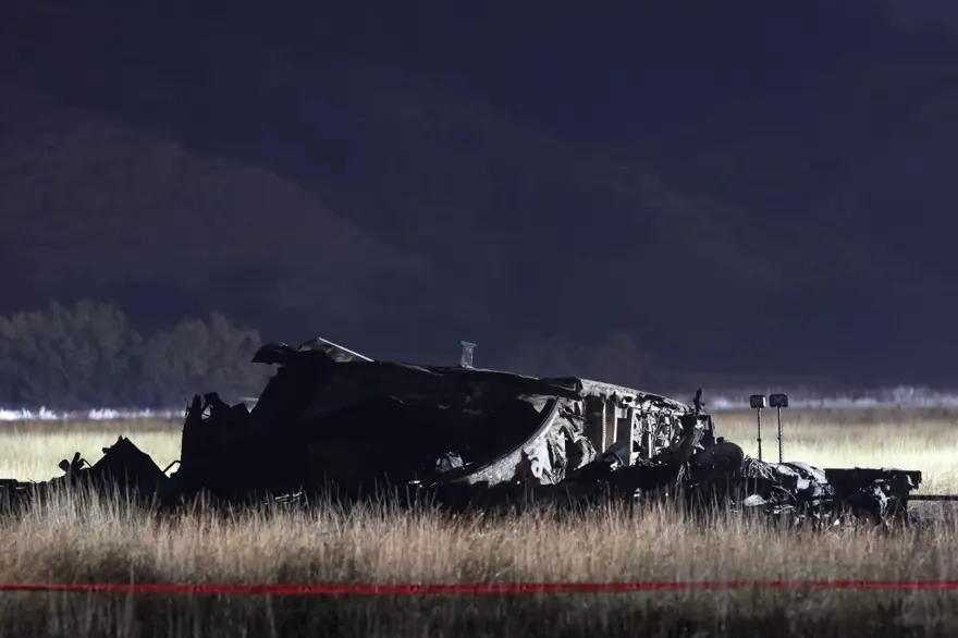 Uçağın ana gövdesi tamamen yanmış durumda ve parçalar geniş bir alana yayılmış.