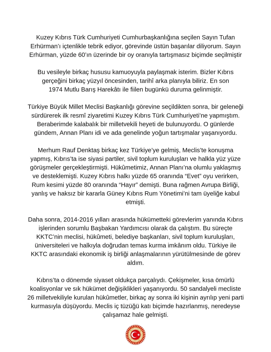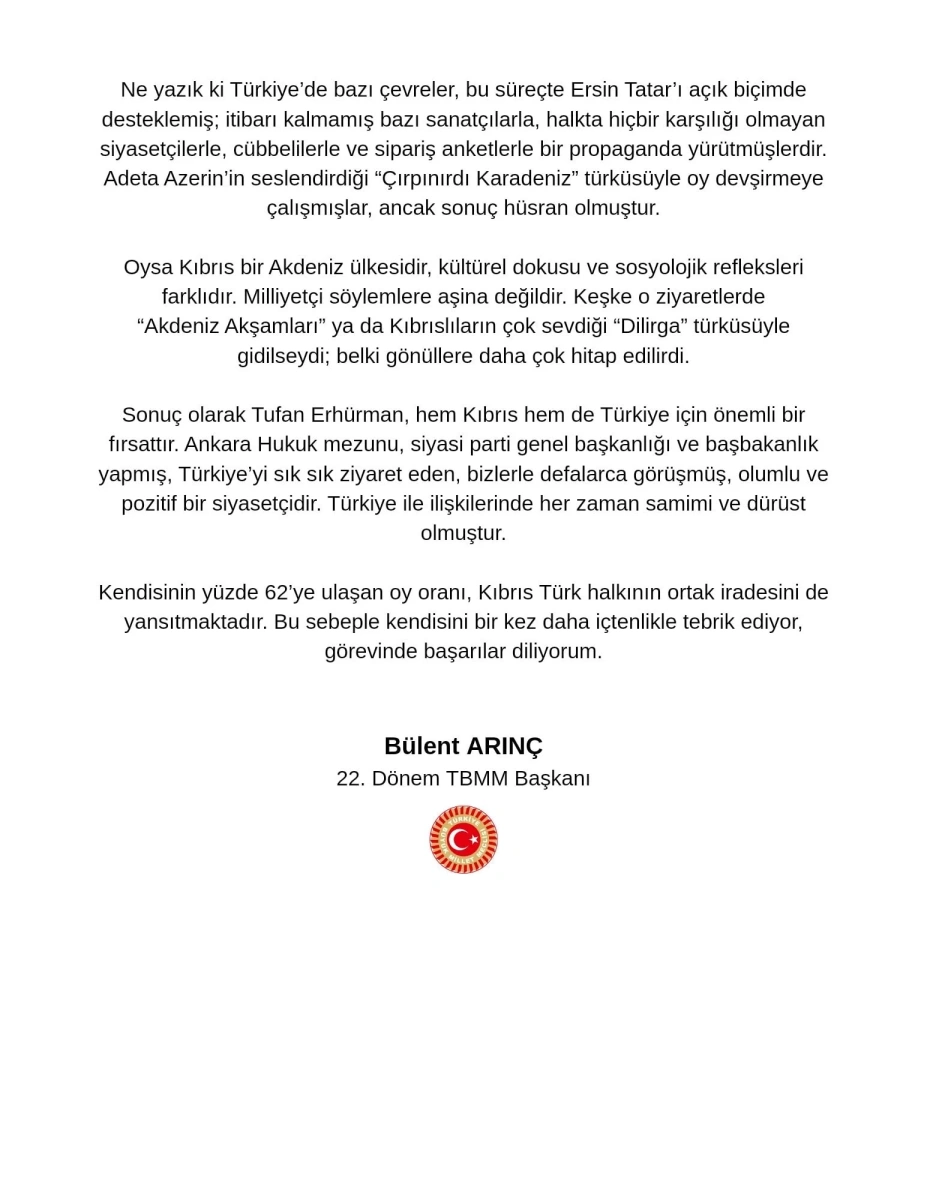 Arınç, "Ne yazık ki Türkiye'de bazı çevreler bu süreçte Ersin Tatar'ı açık biçimde desteklemiş; itibarı kalmamış bazı sanatçılarla, halkta hiçbir karşılığı olmayan siyasetçilerle, cübbelilerle ve sipariş anketlerle bir propaganda yürütmüşlerdir. Adeta Azerin'in seslendirdiği 'Çırpınırdı Karadeniz' türküsüyle oy devşirmeye çalışmışlar, ancak sonuç hüsran olmuştur" ifadelerini kullandı.