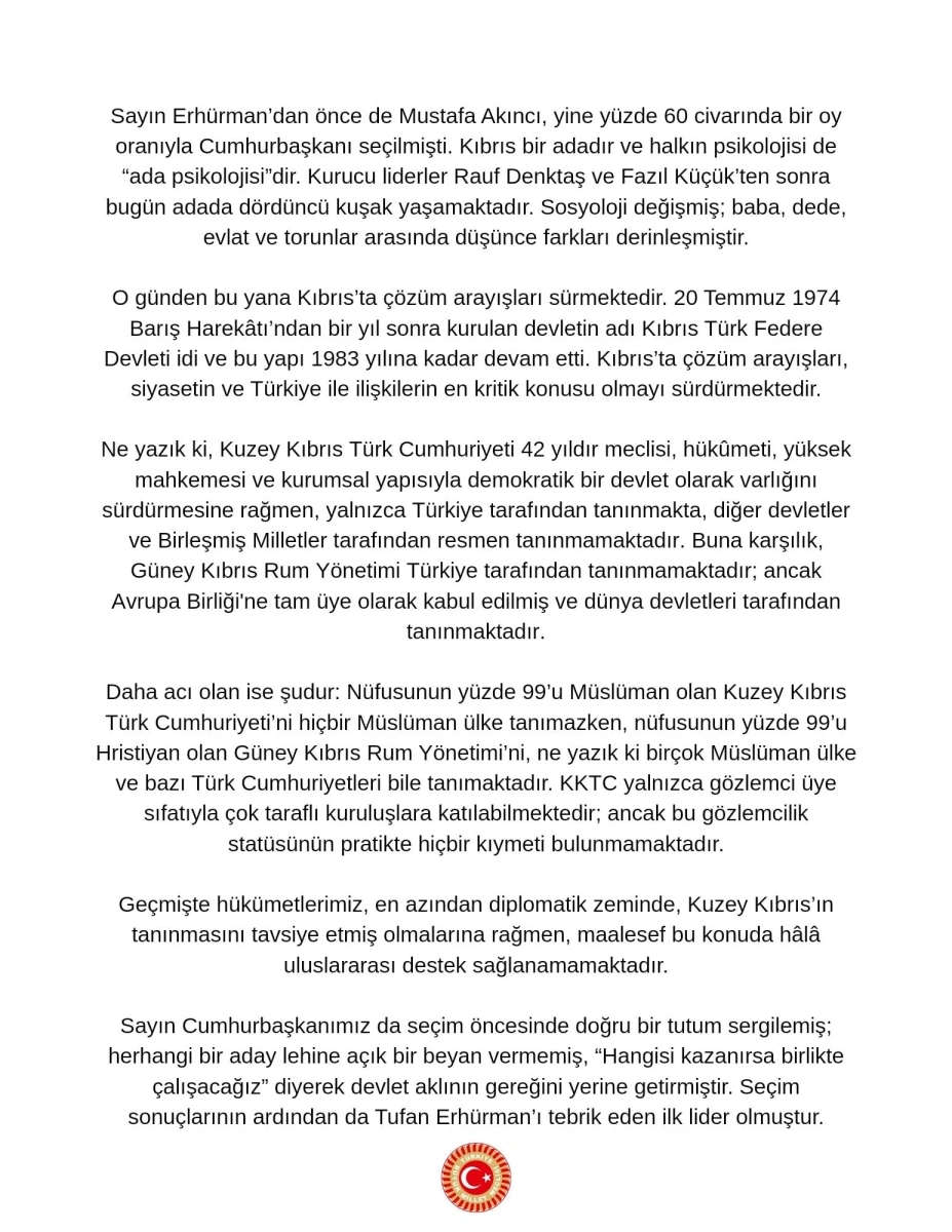 AK Parti kurucusu Bülent Arınç, partisinin KKTC Cumhurbaşkanlığı seçimlerinde Ersin Tatar'a açık destek vermesini sert şekilde eleştirdi. Arınç, Türkiye'den bazı çevrelerin itibarı kalmamış sanatçılar, siyasetçiler ve cübbelilerle propaganda yürüttüğünü ancak sonucun hüsran olduğunu belirtti. CTP Genel Başkanı Tufan Erhürman'ın zaferini tebrik eden Arınç, Erhürman'ın Kıbrıs ve Türkiye için önemli bir fırsat olduğunu söyledi.