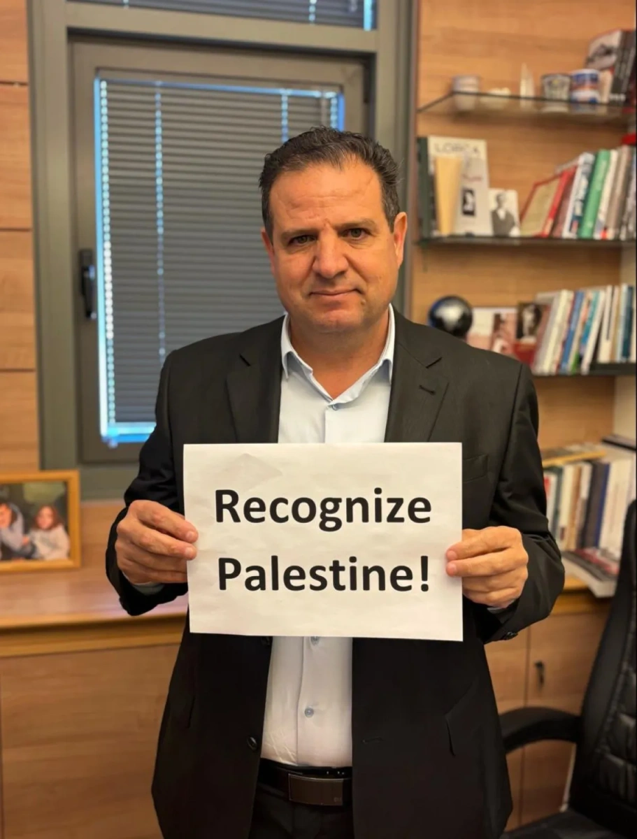 Vekillerden Ayman Odeh, salondan çıkarıldıktan sonra sosyal medyadan açtığı pankartın fotoğrafını paylaştı.