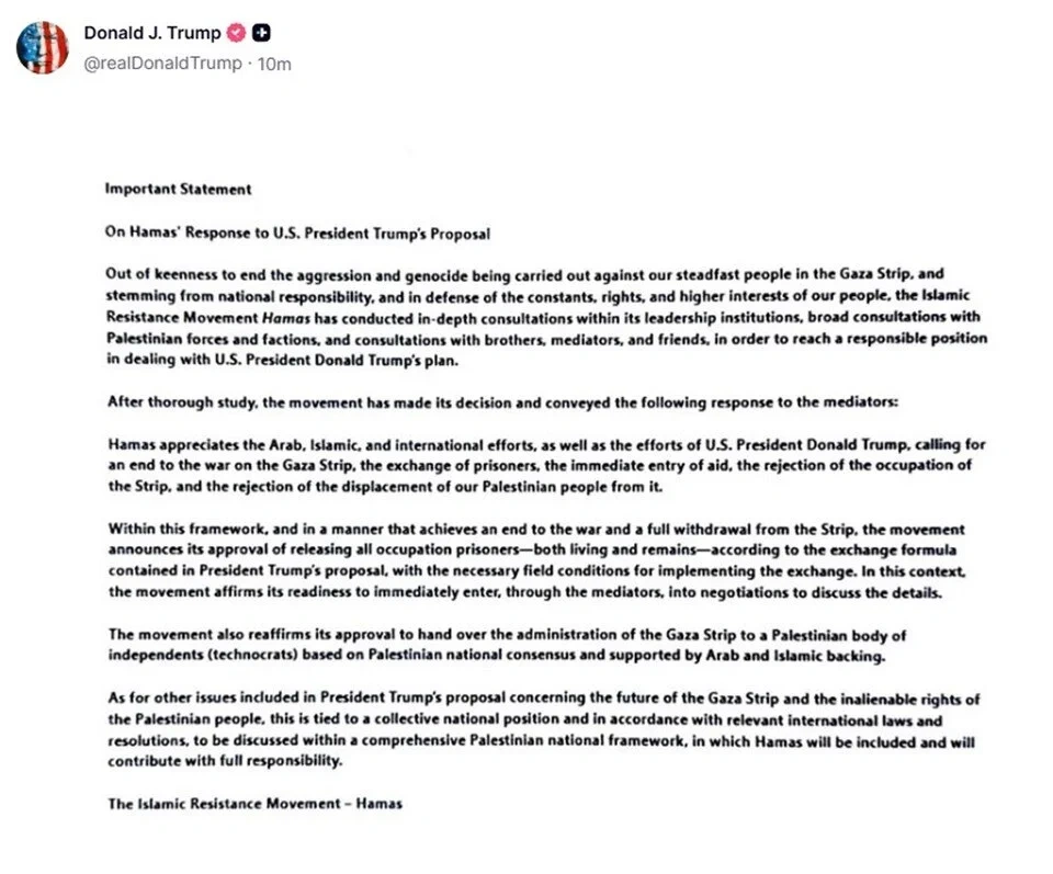 Hamas'ın Trump'ın Gazze planını müzakereye hazır olduğunu açıklamasının ardından İsrail Savunma Kuvvetleri (IDF), planın ilk aşamasının uygulanması için operasyonlarını durdurmaya ve savunma durumuna geçmeye hazırlandığını duyurdu. Hamas, İsrail'in savaşı sona erdirip tamamen çekilmesi karşılığında tüm İsrailli esirleri serbest bırakmayı ve Gazze yönetimini bağımsız Filistinli teknokratlara devretmeyi kabul etti. Trump, Hamas'ın yanıtını "kalıcı barışa hazır olduklarını düşünüyorum" diyerek değerlendirdi ve Türkiye'ye de arabuluculuk için teşekkür etti.