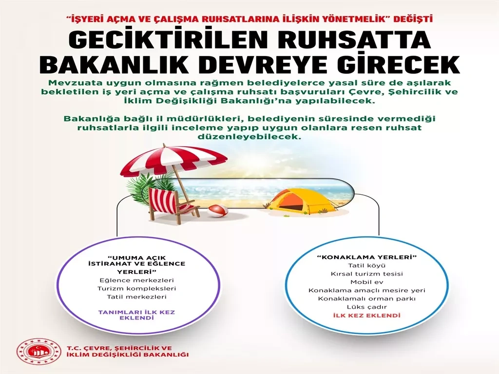 İş yeri açma ve çalışma ruhsatlarına ilişkin yönetmelikte köklü değişiklikler yapıldı ve belediyelerce geciktirilen ruhsat başvurularında Çevre, Şehircilik ve İklim Değişikliği Bakanlığı yetkili olacak. Yeni düzenlemede konaklama yerleri, turizm amaçlı kiralanan konutlar, güzellik salonları ve halı yıkama yerleri için detaylı şartlar getirildi. Ayrıca güneş enerji santrallerinin ve jeotermal seraların sınıflandırması değiştirilerek ruhsatlandırma kolaylaştırıldı.