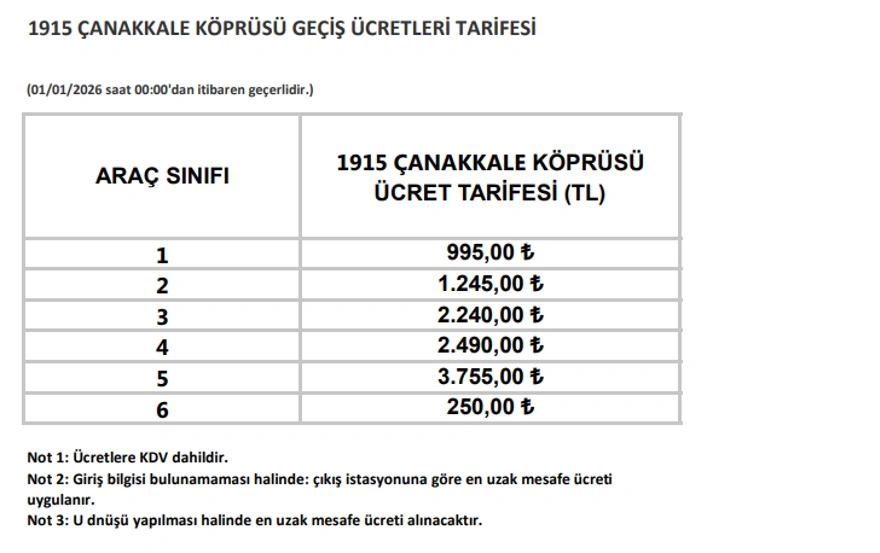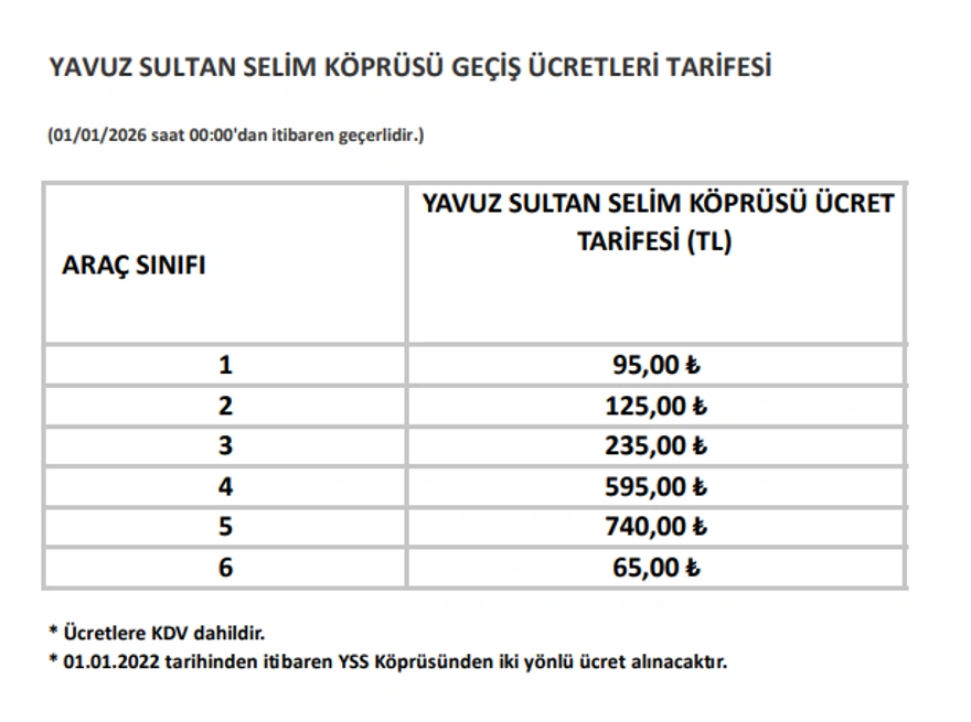 1 Ocak 2026'dan itibaren köprü ve otoyol geçiş ücretlerine zam yapıldı. 15 Temmuz ve FSM Köprüsü tek yön geçiş ücreti 47 TL'den 59 TL'ye, Yavuz Sultan Selim Köprüsü 80 TL'den 90 TL'ye çıkarıldı. Osmangazi ve 1915 Çanakkale köprülerinin ücreti 795 TL'den 995 TL'ye, İstanbul-Ankara otoyol ücreti ise 338 TL oldu.