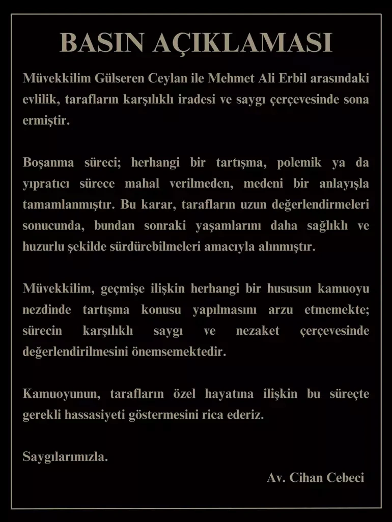 Ceylan'ın avukatı, boşanma sürecinin herhangi bir tartışmaya yer verilmeden, medeni bir anlayışla tamamlandığını ifade etti.