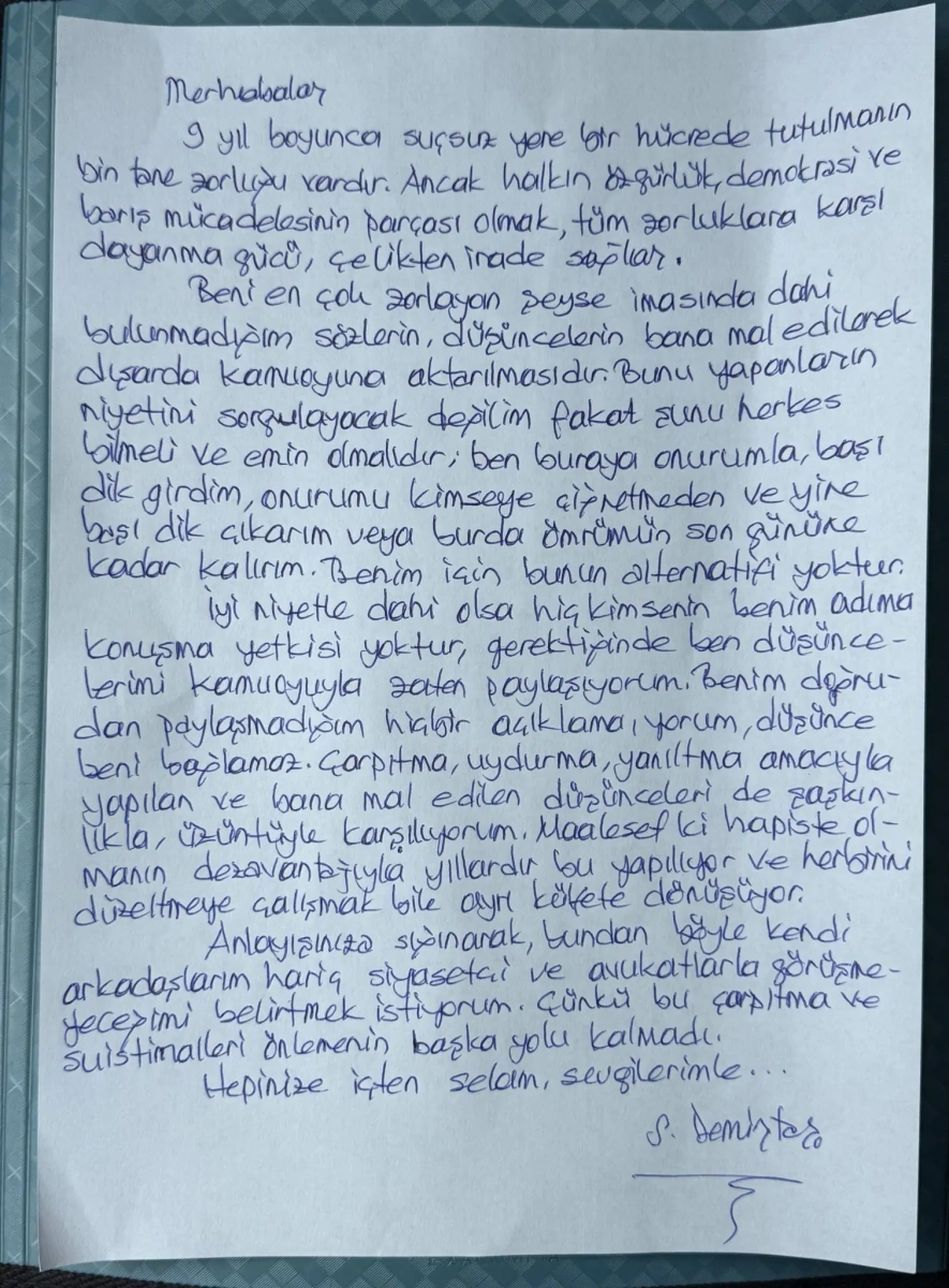 Demirtaş mektubunda, iyi niyetle dahi olsa kimsenin kendi adına konuşma yetkisi olmadığının altını çizdi.