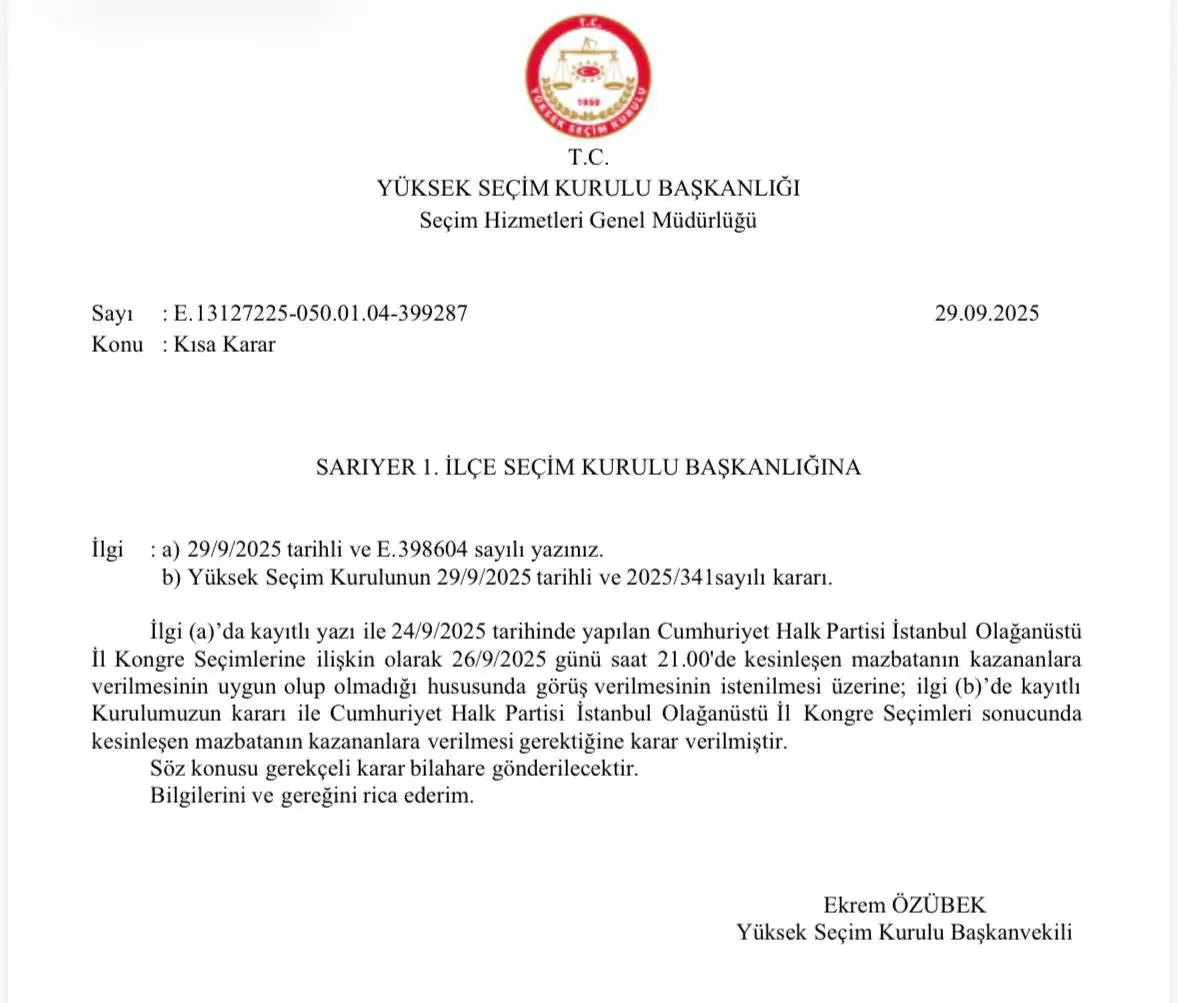 CHP İstanbul İl Başkanı Özgür Çelik, mahkeme kararıyla görevden alınmasına ve yerine kayyum atanmasına rağmen, YSK kararıyla gerçekleştirilen olağanüstü kongrede yeniden seçildi ve bugün mazbatasını aldı. Mazbata tesliminde 1,5 saatlik gecikme yaşandı ancak Çelik sonunda belgeyi teslim aldı. Çelik, "Ben örgütün iradesiyle geldim, örgütün iradesiyle giderim. Siyasallaşmış yargının kararlarına yönelik konuşanlara sözüm yok" dedi.