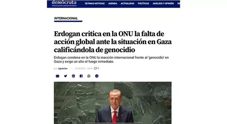 Erdoğan'ın 80. BM Genel Kurulu'ndaki konuşması, Gazze soykırımı, Filistin tanıma, Doğu Akdeniz, Ukrayna savaşı, Kafkasya, Suriye ve Kıbrıs gibi konuları kapsayarak dünya basınında büyük ilgi gördü.