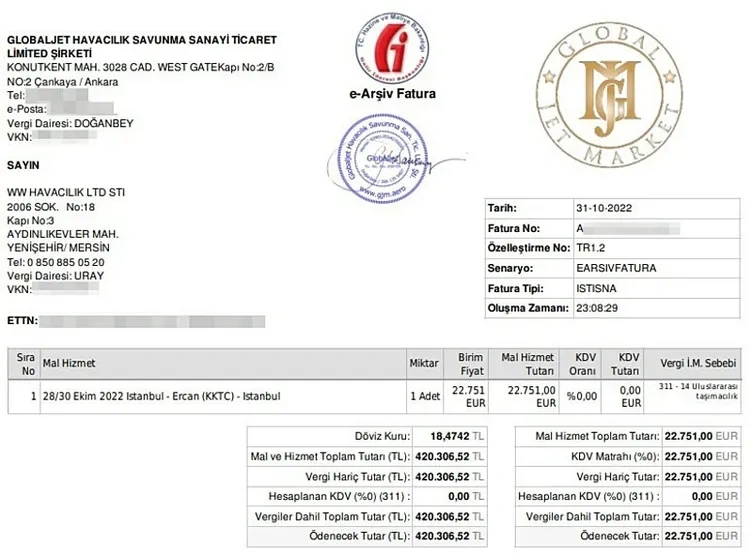 22 bin euro tutarındaki jet kiralama faturasının, Kuzey İstanbul Modern A.Ş. tarafından karşılandığı belirlendi.